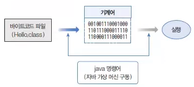 자바를 사용하기 위해 JDK를 설치하면 자바 언어로 작성한 소스 파일을 만들고 컴파일할 수 있다. 오늘은 그 과정에 대해 아주 간단하게 정리해보려고 한다. 1. 자바 소스코드(.java) 작성자바 소스코드는 사람이 이해하기 쉬운 자연어로 된 코드로 자바 소스 파일의 확장명은 .java이다. 2. 컴파일 - 바이트코드소스 파일을 작성한 후에는 컴파일을 해야 한다. javac(java compiler) 명령어는 소스 파일을 컴파일하는데, 이 단계에서 나오는 파일은 확장명이 .class인 바이트 코드이다.바이트 코드는 컴퓨터가 직접 읽을 수 없는 중간 형태의 코드이다. 윈도우, 맥OS, 리눅스 등 어떤 운영체제라 하더라도 동일한 소스 파일을 javac로 컴파일하면 모두 동일한 바이트코드 파일이 생성된다. 3..